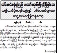 အခု က ေဒၚစု သတင္းက သူတို ့ေဖာ္ျပတယ္။စာလံုးရြယ္ ေသးေသး နဲ ့သတင္းစာရဲ ့အေရးမပါတဲ့ ေနရာမွာ ေနာက္ၿပီး ၀ါဒျဖန္ ့ခ်ိေရး ေၾကာ္ျငာေတြၾကားမွာ အေပၚမွာေတာ့