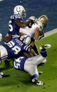 - Chris Pennington, left, and Aerif Harlan of New Orleans are seen before the NFL Super Bowl XLIV football game between the Indianapolis Colts and New Orleans Saints in Miami, Sunday, Feb. 7, 2010. (AP Photo/Chris O’Meara)