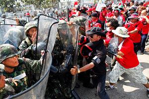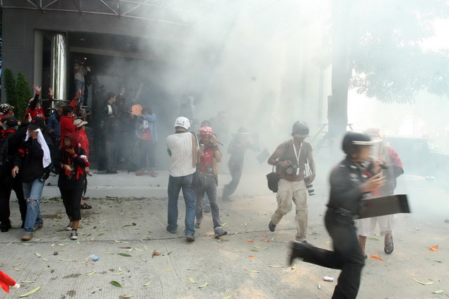 သက္ဆင္လိုလားတဲ့ အနီ၀တ္ ဆႏၵျပသူေတြ ကို ထိုင္းစစ္တပ္က မ်က္ရည္ယိုဗံုးေတြ၊ မီးသတ္ ပိုက္ေတြ သံုး ၿပီး စတင္ ၿဖိဳခြဲခဲ့တယ္