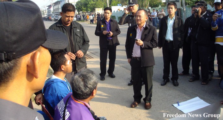 ဆႏၵျပရာေနရာသို႕ မဲေဆာက္ UNHCR တာ၀န္ရွိသူမ်ားႏွင့္ မဲေဆာက္ျမိဳ႕ပိုင္ ကစ္တိဆတ္သိုးမြန္းဆတ္ ေရာက္ရွိလာေသာအခ်ိန္တြင္ ကိုင္ေဆာင္ထားေသာ လစ္ပစ္ဗံုးတလံုးကို ထိုင္းအထူးရဲတပ္ဖြဲ႕