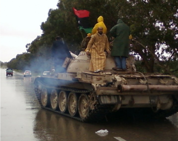 ၿငိမ္းခ်မ္းၿငိမ္း၊ ၊ပံုမွာ ေတြ ့ရတာ က ဆႏၵျပမႈ ေတြ ေၾကာင့္ ထရီပိုလီ ၿမိဳ ့စြန္မွာ ခရီးသည္တင္ ကားေတြ မဆြဲေတာ့ ဘဲ ရပ္ထားလို ့ လစ္ဗ်ားစစ္သား ေတြက အေရး ေပၚ ခရီးသည္ ေတြ ကို တင့္ကား နဲ ့လိုက္ပို ့တဲ့ ပံုပါ ။ ခရီးသည္ေတြ က တင့္ကား အထဲ မွာ လည္းထိုင္စီး လို ့ရတယ္။ဒါေပမယ့္ အျပင္မွာ လဲ မတ္တပ္ရပ္ ၿပီးလိုက္ လို ့ရတယ္။ တင့္ကား တပ္မႈး ကေတာ့ အျပင္ကေန မစီးဘို ့အၾကံေပးတယ္။ ကဒါဖီ ရဲ ့ၾကံ့ဖြတ္ ေတြ က ျပည္သူေတြ ကို ေခ်ာင္းပစ္မွာ စိုးလို ့တဲ့ ။