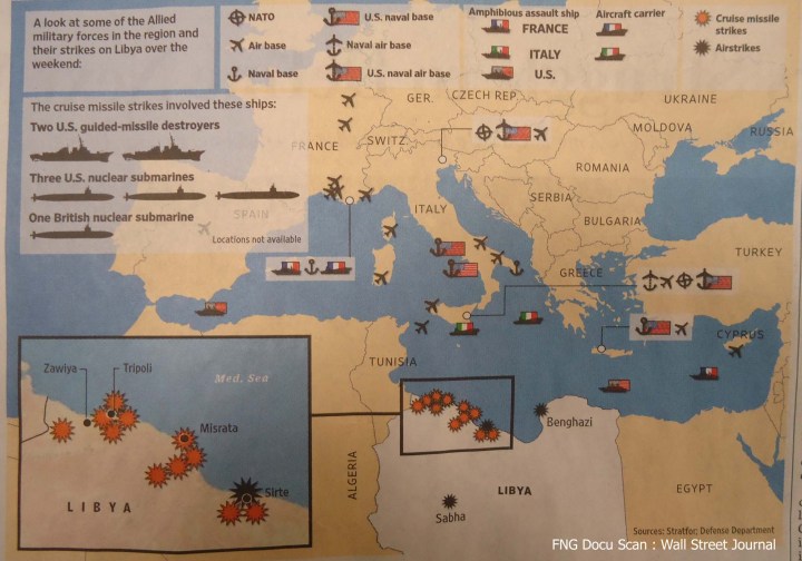 ႏိုင္ငံ အေရွ ့ပိုင္းက အက္ဒါဘီယား နဲ ့ မစ္ဆူရတာ ၿမိဳ ့ေတြ မွာရွိတဲ့ ကဒါဖီ ရဲ ့တပ္ေတြ ကို ေလေၾကာင္းကေန ဗံုးႀကဲတိုက္ခိုက္မႈေတြ ဆက္လက္ျပဳလုပ္ ေန ပါတယ္။ လစ္ဗ်ား ေခါင္းေဆာင္ ကဒါဖီ ဟာ မဟာမိတ္ တပ္ေတြ