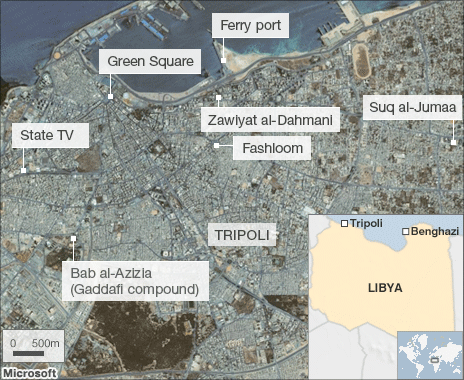 တပ္ ေတြ ၊ ကဒါဖီ ပုန္းေအာင္ေနတယ္ လို ့ ယူဆရတဲ့ Bab al-Azizia စစ္စခန္းေတြ ကို