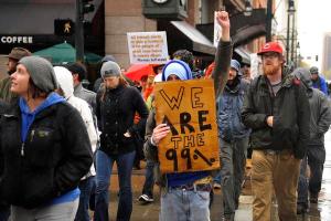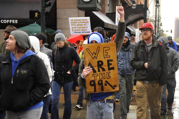 Several hundred Occupy Denver protesters marched to Denver’s Federal Reserve Bank branch in downtown Denver then back to their encampment in the park adjacent to the Colorado State Capitol Saturday afternoon, October 8, 2011. With another march scheduled for next Saturday the event is becoming a regular fixture of the anti-greed, anti-business movement. Karl Gehring/The Denver Post