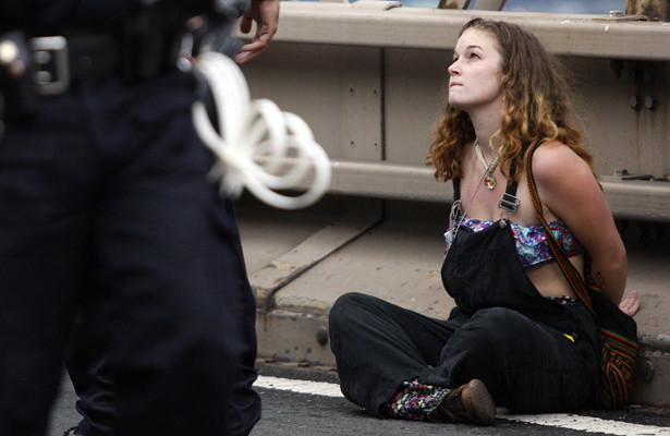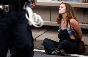 A protester looks up at a police officer after being arrested on the Brooklyn Bridge during an Occupy Wall Street protest in New York October 1, 2011. REUTERS/Jessica Rinaldi (UNITED STATES – Tags: BUSINESS CIVIL UNREST)