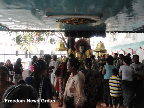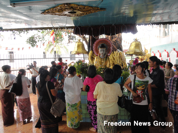 ဖူးမ်ား ျဖင့္ ျပည့္ ႏွက္ ေန ၿပီး ေရႊတိဂံု ေစတီ ေတာ္ ရင္ ျပင္ ရွိ ဘုရား တစ္ဆူ မွာ မ်က္ လံုး