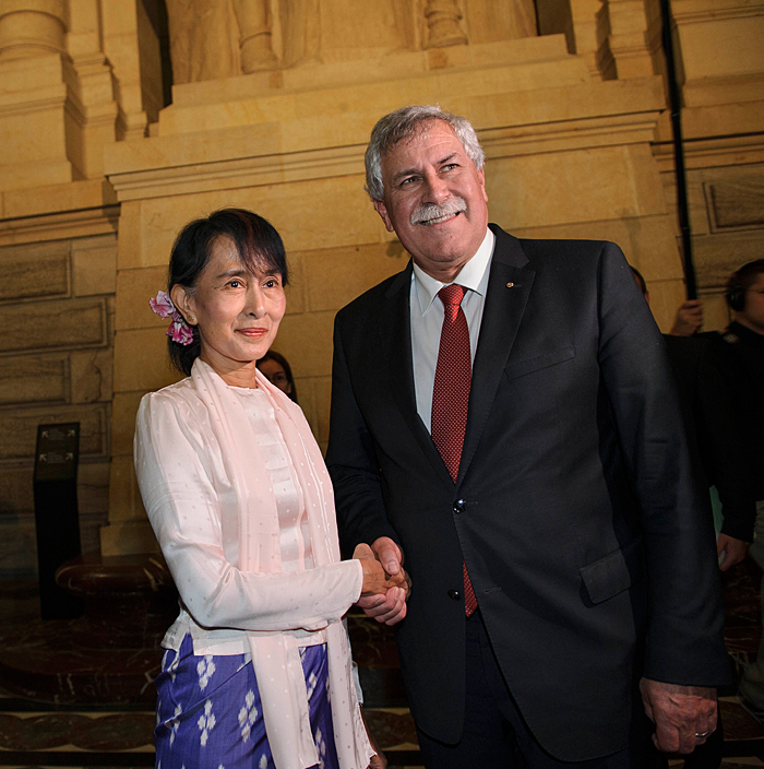 - မၾကာမီက ကၽြန္မရဲ႕ တုိင္း ျပည္တြင္း ျဖစ္ေပၚခဲ့တဲ့အေျပာင္း အလဲေတြေၾကာင့္ လူႀကီးမင္းတို႔ နဲ႔အတူ ကၽြန္မ ရွိေနခဲ့တာျဖစ္ပါ တယ္။ ဒီအေျပာင္းအလဲေတြျဖစ္ ေပၚလာခဲ့ရတာဟာ လူႀကီးမင္း တို႔နဲ႔ အျခားေသာ လြတ္လပ္မႈနဲ႔ တရားမွ်တမႈကို ခ်စ္ျမတ္ႏုိးသူေတြ ေၾကာင့္ျဖစ္ၿပီး ဒီလူေတြက ကၽြန္မ တုိ႔ရဲ႕အေျခအေနကို ကမၻာလံုး ဆုိင္ရာအဆင့္ အာ႐ံုစိုက္မႈရ ေအာင္ လုပ္ေပးခဲ့ပါတယ္။ ကၽြန္မ တုိင္းျပည္အေၾကာင္း ဆက္မေျပာ ခင္ ကၽြန္မတုိ႔ရဲ႕ ယံုၾကည္ခ်က္အ က်ဥ္းသားေတြအေၾကာင္း ေျပာ ခ်င္ပါတယ္။ ဒီလို အက်ဥ္းသား မ်ဳိးေတြ ျမန္မာႏုိင္ငံမွာ ရွိေနဆဲ ပါပဲ။ လူသိမ်ားတဲ့ အထိန္းသိမ္းခံ အက်ဥ္းသားေတြကို ျပန္လႊတ္ ေပးခဲ့ၿပီး က်န္ေနတာက လူသိပ္ မသိတဲ့သူေတြမု႔ိ ေမ့သြားၾကမွာ ေၾကာက္ရပါတယ္။ ဒီမွာ ကၽြန္မ ရပ္တည္ေနရျခင္းဟာ ကၽြန္မ လည္း တစ္ခ်ိန္က ယံုၾကည္ခ်က္ အက်ဥ္းသားတစ္ဦး ျဖစ္ခဲ့ဖူးလုိ႔ပါ။ ကၽြန္မကို လူႀကီးမင္းတုိ႔ၾကည့္ၿပီး နားဆင္ေနစဥ္မွာပဲ ေက်းဇူးျပဳၿပီး မၾကာခဏ ေျပာေလ့ရွိတဲ့ အမွန္ တရားတစ္ခုျဖစ္တဲ့ ယံုၾကည္ခ်က္ အက်ဥ္းသားတစ္ဦး ရွိေနျခင္းဟာ အရမ္းမ်ားလွတယ္ဆိုတဲ့အခ်က္ ကို သတိရေပးၾကပါ။ မလြတ္လပ္ ေသးတဲ့ တရားဥပေဒရဲ႕ အက်ဳိး ေက်းဇူးေတြကို ခံစားခြင့္မရေသး တ့ဲသူေတြရဲ႕ အေရအတြက္ဟာ ကၽြန္မတု႔တုိင္းျပည္မွာ တစ္ဦး ထက္မက အမ်ားႀကီးရွိပါတယ္။ ေက်းဇူးျပဳ၍ သူတုိ႔ကုိ သတိရေပး ပါ။ သူတုိ႔ ေစာႏုိင္သမွ် ႁခင္းခ်က္ မရွိ လြတ္ေျမာက္ေရး အက်ဳိး သက္ေရာက္မႈရွိေအာင္ ျဖစ္ႏုိင္ ေျခရွိတာမွန္သမွ် လုပ္ေပးၾကပါ။