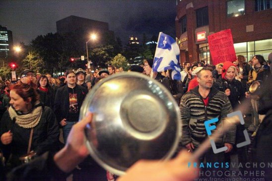 ေမ ၁၈ ရက္ ေနာက္ပိုင္းမွာဥပေဒ ၇၈ ကိုတိုက္ရိုက္စိန္ေခၚတဲ့ Casseroles လို႔ေခၚတဲ့ ဒယ္အိုးဆႏၵျပမႈေတြ ေပၚ ေပါက္ လာတယ္။ဒီဆႏၵျပမႈ႔ပံုစံက စပိန္စကားေျပာတဲ့ လက္တင္အေမရိကတိုက္က လူၾကိဳက္မ်ားတဲ့ဆႏၵျပပံုစံပါ။အာဂ်င္တီးနား၊ ခ်ီလီ၊ ဥရုေဂြးနဲ႔ စပိန္ ႏိုင္ငံေတြမွာ ဒီလိုပံုစံနဲ႔ ဆႏၵျပၾကပါတယ္။၁၉၇၁ ခုႏွစ္ ခ်ီလီႏိုင္ငံကေနစတင္ခဲ့တဲ့ပံုစံျဖစ္ပါတယ္။ေလာေလာဆယ္ ၂၀၀၁ ခုႏွစ္မွာ အာဂ်င္တီးနားမွာ လဲျဖစ္ပြားခဲ့ ပါတယ္။ဆႏၵျပတဲ့သူေတြက သူတို႔ရဲ့ ဒယ္အိုး၊ ဒန္အိုးေတြယူလာျပီး ေယာင္းမေတြ ဇြန္းေတြနဲ႔ သံစံုျမည္ေအာင္တီးကာ သတ္မွတ္ထားတဲ့ေနရာ ဒါမွမဟုတ္ ရပ္ကြက္ထဲ ျမိဳ႔ထဲ လွည့္လည္ဆႏၵျပၾကတယ္။ညတိုင္း ည ၈ နာရီမွာ စတင္ျပီး ၁၀ နာရီမွာ လူစုခြဲၾကတယ္။ ဒယ္အိုးဆႏၵျပပြဲ ‘Casseroles’ က မြန္ထရီရယ္ျမိဳ႔ကေနစတင္ခဲ့ျပီး ကေနဒါႏိုင္ငံရဲ့ ျမိဳ႔ေပါင္း ဒါဇင္ေက်ာ္ထိ ျပန္႔ႏွံ႔သြားပါတယ္။ဒါတင္မကပါဘူး New York နဲ႔ California က Occupy movement အဖြဲ႔ဝင္မ်ားကလဲ မြန္ထရီရယ္ျမိဳ႔သို႔ လူကိုယ္တိုင္လာေရာက္ ပူးေပါင္းပါဝင္ၾကပါတယ္။ဒါ့ေၾကာင့္လဲ ကမၻာ့ဆႏၵျပမႈ႔ေတြဟာ တခုနဲ႔တခု ကြင္းဆက္ေတြျဖစ္လာေနျပီလို႔ေျပာဆိုလာၾကပါတယ္။