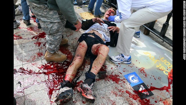 BOSTON – APRIL 15: (EDITOR’S NOTE: THIS IMAGE CONTAINS GRAPHIC CONTENT) A victim of the first explosion is helped on the sidewalk of Boylston Street, after two explosions went off near the finish line of the 117th Boston Marathon. (Photo by John Tlumacki/The Boston Globe via Getty Images)
