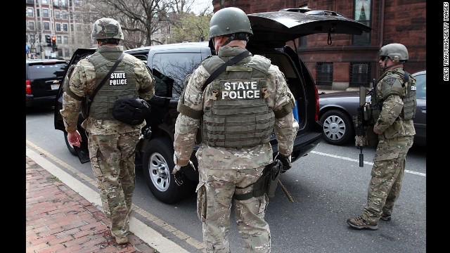 BOSTON, MA – APRIL 15: Massachusetts State Police guard an area near Kenmore Square after two bombs exploded during the 117th Boston Marathon on April 15, 2013 in Boston, Massachusetts. Two people are confirmed dead and at least 23 injured after two explosions went off near the finish line to the marathon. (Photo by Alex Trautwig/Getty Images)