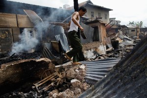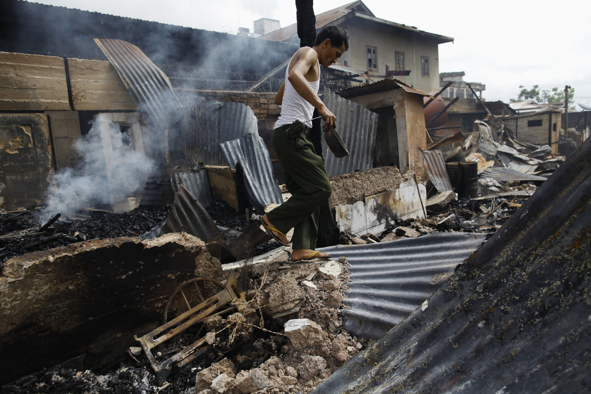 A soldier walks among debris after a riot between Muslims and Buddhists in Lashio township. Security forces struggled to control Buddhist mobs who burned Muslim homes for a second day in the northern Myanmar city of Lashio in a dangerous widening of ultra-nationalist Buddhist violence. (Soe Zeya Tun/Reuters photo)