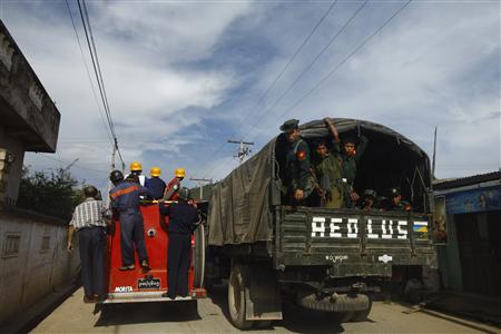 Firefighters and soldiers head to the scene of a riot between Muslims and Buddhist in Lashio township, May 29, 2013. REUTERS/Soe Zeya Tun