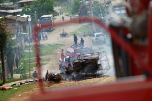 Firefighters extinguish a fire during a riot between Buddhist and Muslims in Lashio township May 29, 2013. Buddhist mobs armed with sticks and machetes burned Muslim homes on Wednesday for a second day in the northern Myanmar city of Lashio, contradicting government assurances that soldiers and police had restored calm. REUTERS/Soe Zeya Tun (MYANMAR – Tags: TPX IMAGES OF THE DAY CIVIL UNREST POLITICS) – RTX104X0