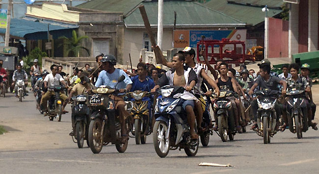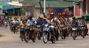 Hundreds of Buddhists on motorcycles armed with sticks patrol in the streets of in Lashio, northern Shan State, Myanmar, Wednesday, May 29, 2013. Sectarian violence spread to a new region of Myanmar, with a mob burning shops in the northeastern town after unconfirmed rumors spread that a Muslim man had set fire to a Buddhist woman. (AP Photo/Gemunu Amarasinghe)