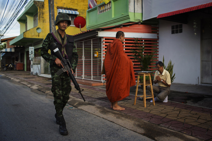 A soldier from the 23rd Battalion of the Thai Army provides security as monks from the Nopawong Saram Temple collect alms on their morning rounds in Pattani, Southern Thailand on June 9, 2013.