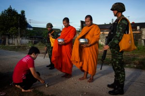Soldiers from the 23rd Battalion of the Thai Army provide security as monks from the Lak Muang Temple collect alms in Pattani, Southern Thailand on June 11, 2013.