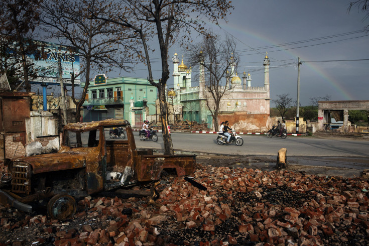 People drive past a burned out vehicle, damaged buildings and mosque, that was also damaged, in the Mingalar Zayyone Muslim quarter, that was razed by Buddhists in ethnic violence in March, in Meikhtila, Myanmar (Burma) on May 23, 2013. The now destroyed Mingalar Zayyone Madrassa where Abdul Razak, 15 (also called Ye Myin) was killed. In the four days of ethnic violence starting on March 21st, 2013 over 43 people were killed in Meikhtila and nearly 13,000 people, mostly Muslims, were driven from their homes and businesses.