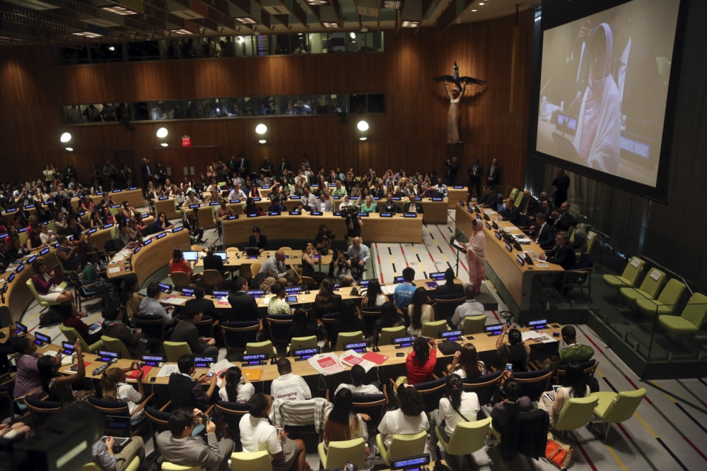 Malala Yousafzai addresses the ëMalala Dayí Youth Assembly, Friday, July 12, 2013 at United Nations headquarters. Malala Yousafzai, the Pakistani teenager shot by the Taliban for promoting education for girls, celebrated her 16th birthday on Friday addressing the United Nations. The U.N. has declared July 12 “Malala Day,” to honor the teen who returned to school in March after medical treatment in Britain for injuries suffered in the October attack. (AP Photo/Mary Altaffer)