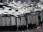 Attacks: Protesters have pelted officers with stones, which can be seen here in front of a defensive formation