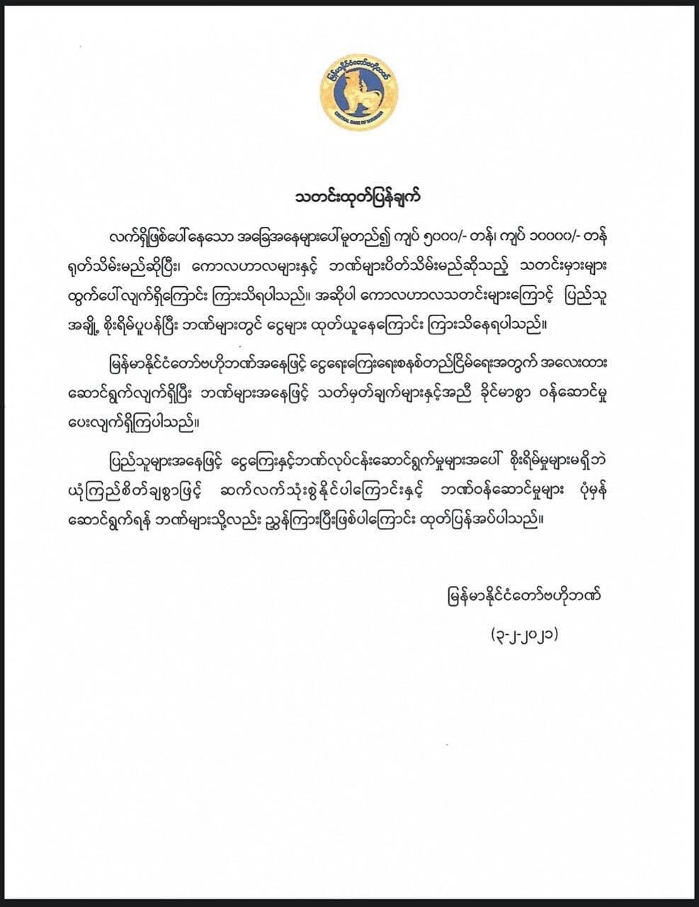 က်ပ္ ငါး ေ ထာင္ တန္ နဲ့ တစ္ ေ သာင္း တန္ ေ တြ ဟာ ေ ကာလ ဟာလ ေ တြ သာ ျဖစ္ တယ္ လို ့ ဗဟိုဘဏ္ ေ ျကျင ာခ်က္ ထုတ္ ျပန္