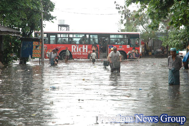 သီတင္း တစ္ပတ္နီးပါးၾကာ ေန ့စဥ္ ရြာ သြန္း ေန ေသာ မိုး ေၾကာင့္ ရန္ကုန္ ၿမိဳ ့အနိမ့္ ပိုင္ ေနရာ