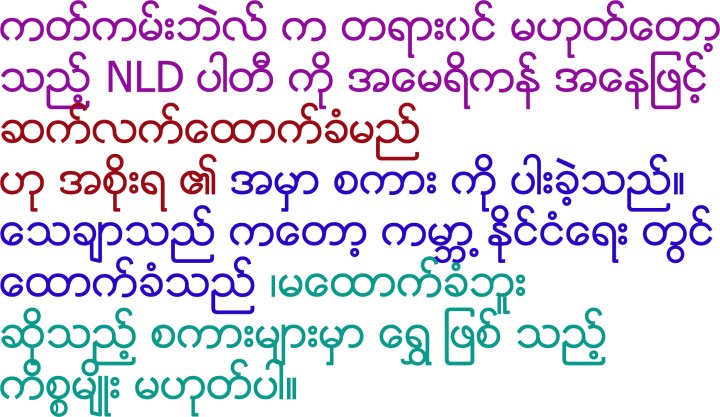 ဟဲ ဟဲ …။ ေခါင္းစဥ္ကို ၾကီးၾကီးက်ယ္က်ယ္ ေလ်ာက္ေရးတာပါဗ်ာ။ ျပီးေတာ့ စာသားေတြက မျဖစ္စေလာက္ ခ်ဳိမုိင္မိုင္ က သလိုမ်ဳိး အေပါစားေတြ ေရးမွာပါ။ အေရးၾကီးတာက စာေခါင္းစဥ္ေလာက္ဖတ္ျပီး ဆက္မဖတ္ၾကရင္ စာဖတ္သူေတြ စိတ္ထဲမွာ အေမရိကန္ျပည္ၾကီးမွာ ျပည္တြင္းေရးျပႆနာေတြ ရွိေနျပီ ပဋိပကၡေတြ ျဖစ္ေနျပီလို႔ မသိစိတ္က စြဲမွတ္သြားရင္ ေမာင္ရစ္ စာေရးရတာ ေအာင္ျမင္ျပီ။ Continue reading “ဒီတစ္ပတ္ အယ္ဒီတာ့ စိတ္ႀကိဳက္ (မိုးမခ အင္တာနက္ စာမ်က္ႏွာမွ)”