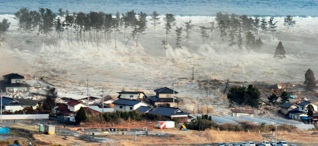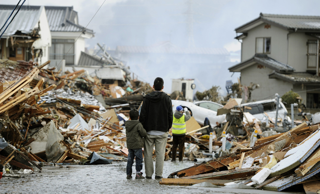 A father and child who lost their home stand in front of debris in Sendai, northern Japan Saturday, March 12, 2011 after Japan’s biggest recorded earthquake slammed into its eastern coast Friday. (AP Photo/Kyodo News) MANDATORY CREDIT, NO LICENSING ALLOWED IN CHINA, HONG KONG, JAPAN, SOUTH KOREA AND FRANCE